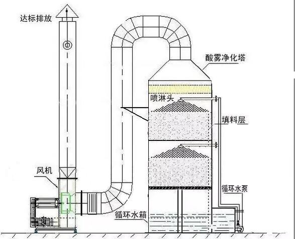 工作原理:廢氣凈化噴淋塔主要的運作方式是廢氣由風(fēng)管引入凈化塔,經(jīng)過填料層,廢氣與氫氧化鈉吸收液進(jìn)行氣液兩相充分接觸吸收中和反應(yīng),廢氣經(jīng)過凈化后,再經(jīng)除霧板脫水除霧后由風(fēng)機(jī)排入大氣。吸收液在塔底經(jīng)水泵增壓后在塔頂噴淋而下,然后回流至塔底循環(huán)使用。凈化后的廢氣達(dá)到地方排放標(biāo)準(zhǔn)的排放要求,低于國家排放標(biāo)準(zhǔn)。